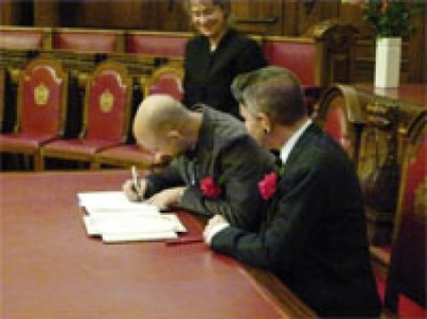 Πρόκειται για έναν 37χρονο Ροδίτη, που ζει στην Κω και έναν 39χρονο Αμερικανό. Σύμφωνα με το neakos.gr, αφού ολοκλήρωσαν την προβλεπόμενη από την νομοθεσία της Μεγάλης Βρετανίας γραφειοκρατική διαδικασία μετέβησαν με πολυμελή παρέα στο δημαρχείο της περιοχής Angel του Λονδίνου και ενώθηκαν με τα δεσμά του γάμου.Στην ουσία, όπως δήλωσε στην εφημερίδα ''Δημοκρατική'' ο 37χρονος, υπέγραψαν σύμφωνο συμβίωσης (civil partnership) ανάλογο με αυτό που ισχύει στην Ελλάδα, το οποίο ωστόσο όχι μόνο επιτρέπει την συμβίωση μεταξύ ατόμων του ιδίου φύλου αλλά τους κατοχυρώνει δικαιώματα........ ανάλογα με αυτά που ισχύουν για τα ετερόφυλα ζευγάρια κατ΄επιταγήν αποφάσεων της Ευρωπαϊκής Κοινότητας.