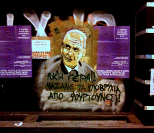 Δεν είναι μόνο το γκράφιτι έξω από τον Ευαγγελισμό, υπάρχει και αλλού στην πόλη γκράφιτι με ήρωα τον Ακη Τσοχατζόπουλο και ένα απίστευτο σύνθημα- λογοπαίγνιο...