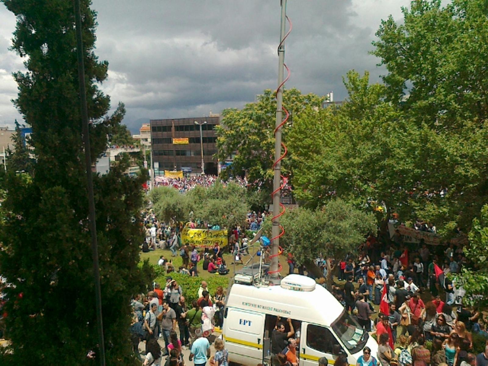Ξεχωριστή συγκέντρωση πραγματοποίησε το ΠΑΜΕ στην πλατεία της Αγίας Παρασκευής. Παρών και ο γγ της ΚΟ του ΚΚΕ, Δημήτρης Κουτσούμπας. Τα μέλη του ΠΑΜΕ κατευθύνθηκαν στη συνέχεια προς το Ραδιομέγαρο, στο προαύλιο του οποίου ενώθηκαν με τους διαδηλωτές του ΣΥΡΙΖΑ, του ΑΝΤΑΡΣΥΑ και των αντιεξουσιαστικών κινήσεων. Μια εικόνα που δεν είχαμε ξαναδεί σε συγκεντρώσεις, τουλάχιστον από τότε που ξέσπασε η κρίση στην Ελλάδα.