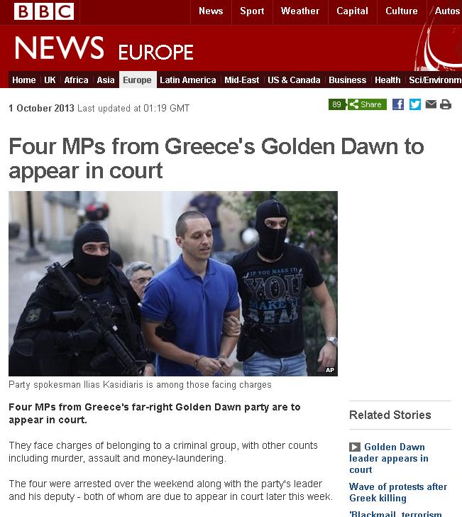Ενώπιον του ανακριτή θα βρεθούν σήμερα τέσσερις βουλευτές από το ακροδεξιό κόμμα της Ελλάδας «Χρυσή Αυγή», αντιμετωπίζοντας κατηγορίες για εγκληματική οργάνωση και, μεταξύ άλλων, για ανθρωποκτονία, επίθεση και ξέπλυμα βρώμικου χρήματος, γράφει σε σημερινό του ρεπορτάζ το BBC παρακολουθώντας τις εξελίξεις με τις απολογίες των συλληφθέντων της Χρυσής Αυγής...Οι τέσσερις συνελήφθησαν το Σαββατοκύριακο μαζί με τον ηγέτη του κόμματος και τον υπαρχηγό του. Και οι δύο αναμένεται να απολογηθούν αργότερα μέσα στην εβδομάδα, γράφει το BBC.