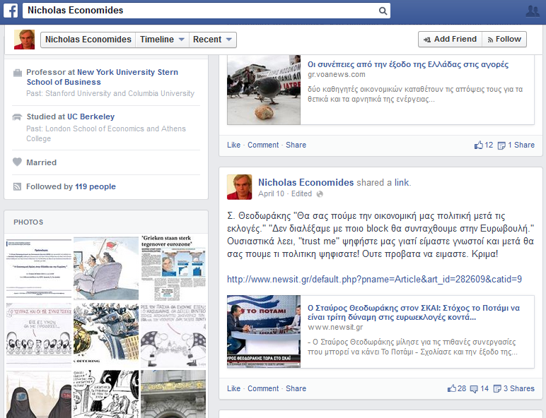 Όμως στον λογαριασμό του στο facebook o καθηγητής Οικονομικών στο Stern School of Business, New York University έχει εκφράσει εντόνως και τη διαφωνία του και την κριτική του απέναντι σε επιλογές του ΣΥΡΙΖΑ και κυρίως έχει ασχοληθεί με τις δηλώσεις του Μανώλη Γλέζου.Ποστάροντας ένα σκίτσο που την ώρα που μιλάει ο Γλέζος στην τηλεόραση ένα μωρό κρύβει τον κουμπαρά του, γράφει στα σχόλια ο Νίκος Οικονομίδης: «Η κυβέρνηση μειώνει τις δαπάνες. Ο Γλέζος και ο Σταθάκης μιλάνε για το πώς θα δημεύσουν τις καταθέσεις για να αυξήσουν τις δαπάνες του κράτους και την φορολογία 9 δις.»