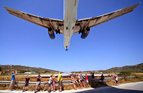 Μπορεί όλοι να ασχολούνται με το αροδρόμιο Princess Juliana στο Σεντ Μάρτιν λόγω του ότι βρίσκεται κοντά στην παραλία με αποτέλεσμα τα αεροπλάνα να πετούν σε απόσταση αναπνοής από τους λουομένους (κάτι που το καθιστά και τουριστικό αξιοθέατο), ωστόσο, κάτι αντίστοιχο συμβαίνει και με ένα ελληνικό αεροδρόμιο. Αυτό της Σκιάθου.Το αεροδρόμιο της Σκιάθου, όπως σημειώνει το perierga.gr, είναι επίσης κοντό σε μήκος και στενό, γεγονός που αναγκάζει τα αεροσκάφη κατά την προσγείωση και την απογείωση να περνούν ξυστά από τα κεφάλια των λουομένων.
