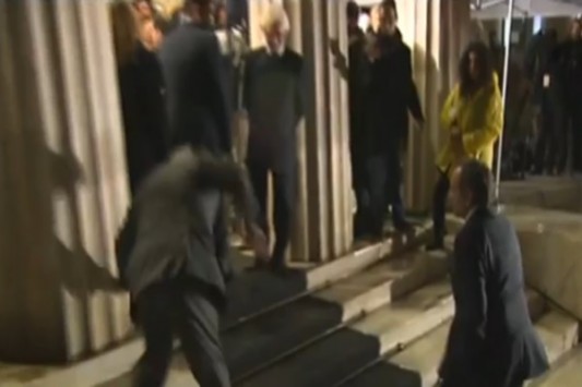 Περίπου στις 18.45, ο πρωθυπουργός έφτασε στη Βουλή συνοδευομένος από τον Τάκη Κάμπρα, ο οποίος γλίστρησε, λόγω της βροχής, και κουτρουβάλησε στα σκαλιά!