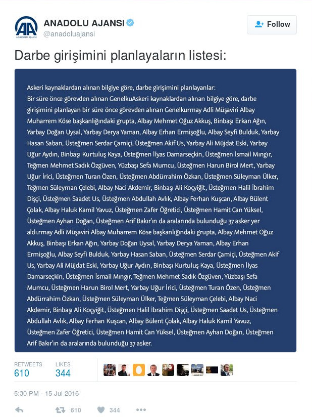Την λίστα με τα ονόματα των πραξικοπηματιών που οργάνωσαν την απόπειρα κατά Ερντογάν έδωσε το τουρκικό πρακτορείο ειδήσεων Ανατολή....